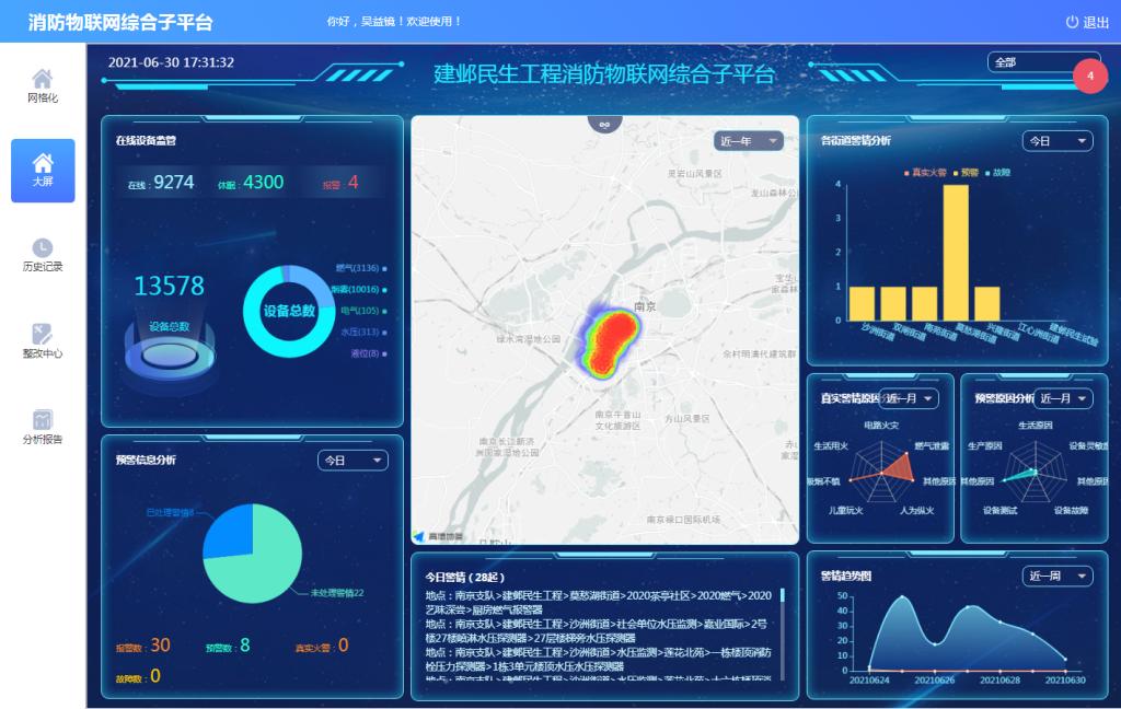 目前,建邺物联网共布设了1万多套消防前端感知设备,包括4000多台无线感烟探测器、6000多台无线可燃气体探测器、176套简易喷淋装置、312套无线水压探测器。终端设备主要分布在建邺区各街道、社区的九小场所、电动车充电点、老旧小区的弱势群体家庭以及群租房等场所,涵盖南京市建邺区各民生工程内的6个街道、72个社区、4个商务建筑、1个派出所。建邺区消防救援大队建立了预警信息三级联动处置机制,成立了大数据中心和24小时监测中心,每天实时采集分析10万条运行数据,及时将预警信息分级分层加推到城市运管企业、行业主管部门和市应急指挥中心,联动处置预警信息。