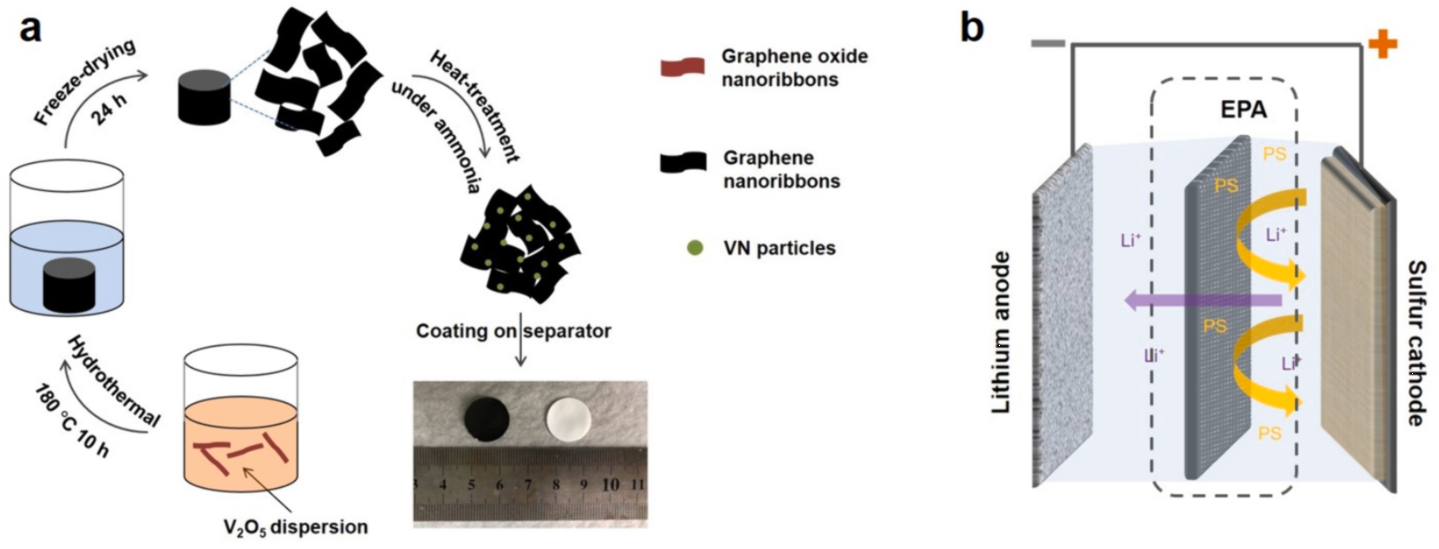 Figure 2. Illustration of rational design and preparation of the EPA interlayer. (a) Preparation process of the EPA interlayer and (b) its effect mechanism in lithium-sulfur batteries.