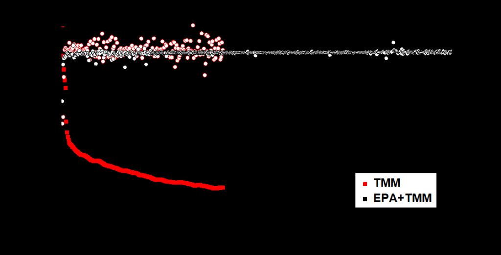 Figure 3. Cycling performance of Li-S batteries with TMM (red) and EPA+TMM (black) at 30 °C.