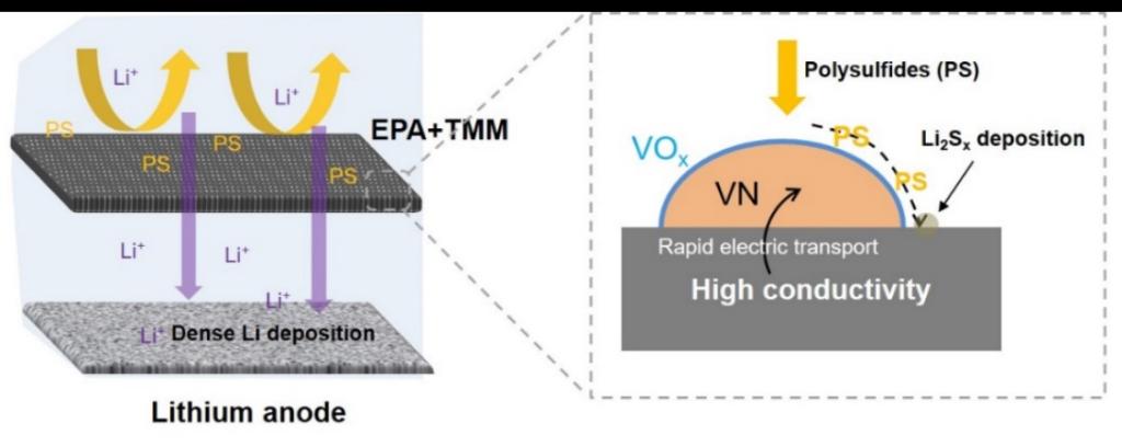 锂硫电池具备高达1675 mAh g−1的理论容量以及2600 Wh kg−1的能量密度,是极具应用前景的先进锂金属二次电池技术。然而,锂硫电池中多硫中间产物易溶解于醚类电解液,迁移至锂负极引发寄生反应,由此形成的“穿梭效应”使得电池循环寿命和安全性能面临重大挑战。传统观点认为催化型隔膜能够抑制穿梭效应,延长电化学寿命。然而设计高催化活性的隔膜,提升界面转换反应动力学,优化锂离子沉积动力学,实现锂硫电池长循环寿命和高安全性仍是挑战性难题。